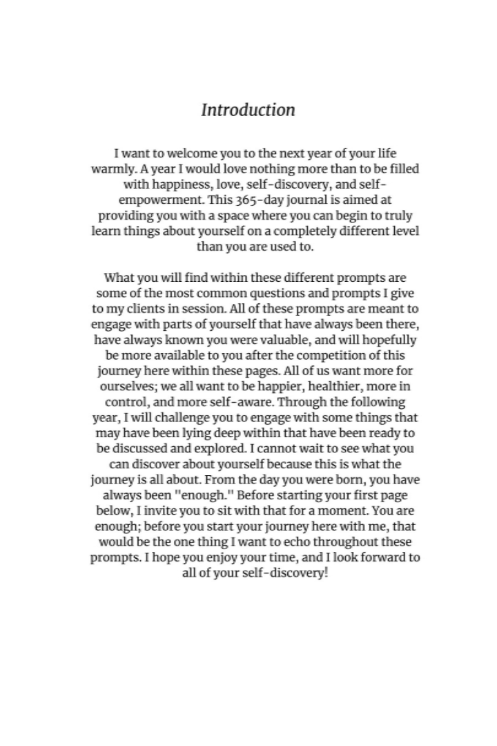 One Day at a Time V.2 is a year-long journal aimed at individuals wanting to improve their self-understanding. This journal was made to engage with the parts of yourself that need it the most. Within these unique 365 individual prompts, you will find some of the most common questions I ask my clients that are specifically aimed at making you think just a little deeper into yourself to start to see who you are. My hope for you by the time you reach this journal's final page is that you will gain a more fundamental, authentic understanding of yourself: Tyler J. Jensen, a licensed psychotherapist, designed and created this journal. Take this time for yourself each day, you deserve it. You have earned this time to set aside and learn or unlearn things about yourself that have been waiting to be seen. I appreciate the work you are about to do and cannot wait to share in the discovery alongside you. This is not a replacement for active therapy. This journal is meant as supplemental material for self-guidance along your therapeutic journey.